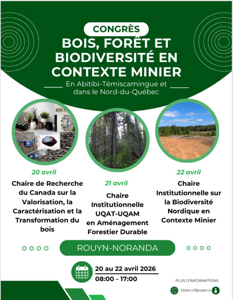 Du 20 au 22 avril prochain, le Congrès Bois, Forêt et Biodiversité en contexte minier en Abitibi-Témiscamingue et dans le Nord-du-Québec présentera trois colloques à Rouyn-Noranda. Des projets de recherche concernant la pollution industrielle seront présentés dans les blocs 1 du colloque de la Chaire en Aménagement Forestier Durable (AFD) et de la Chaire sur la Biodiversité nordique en Contexte Minier (BCM).